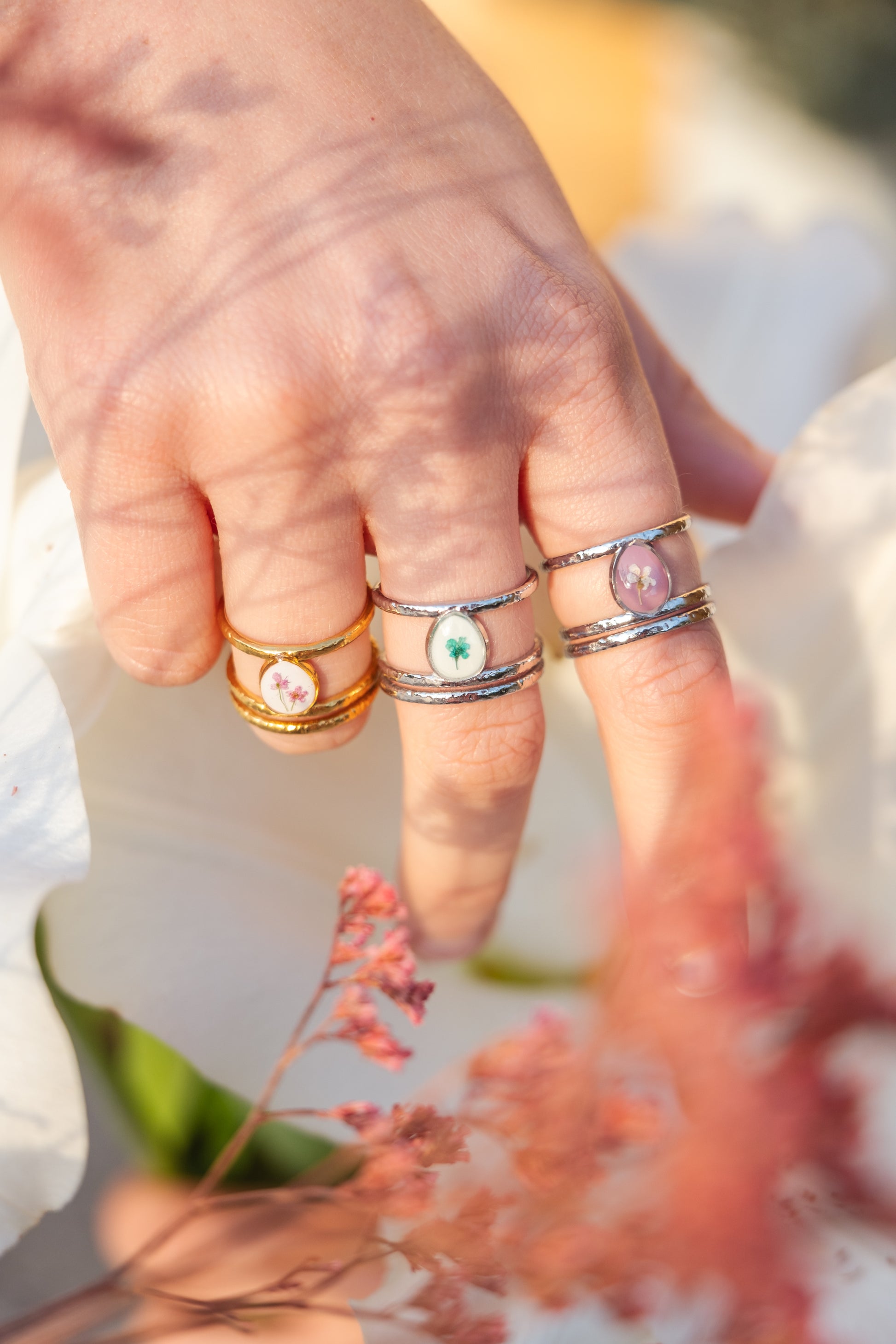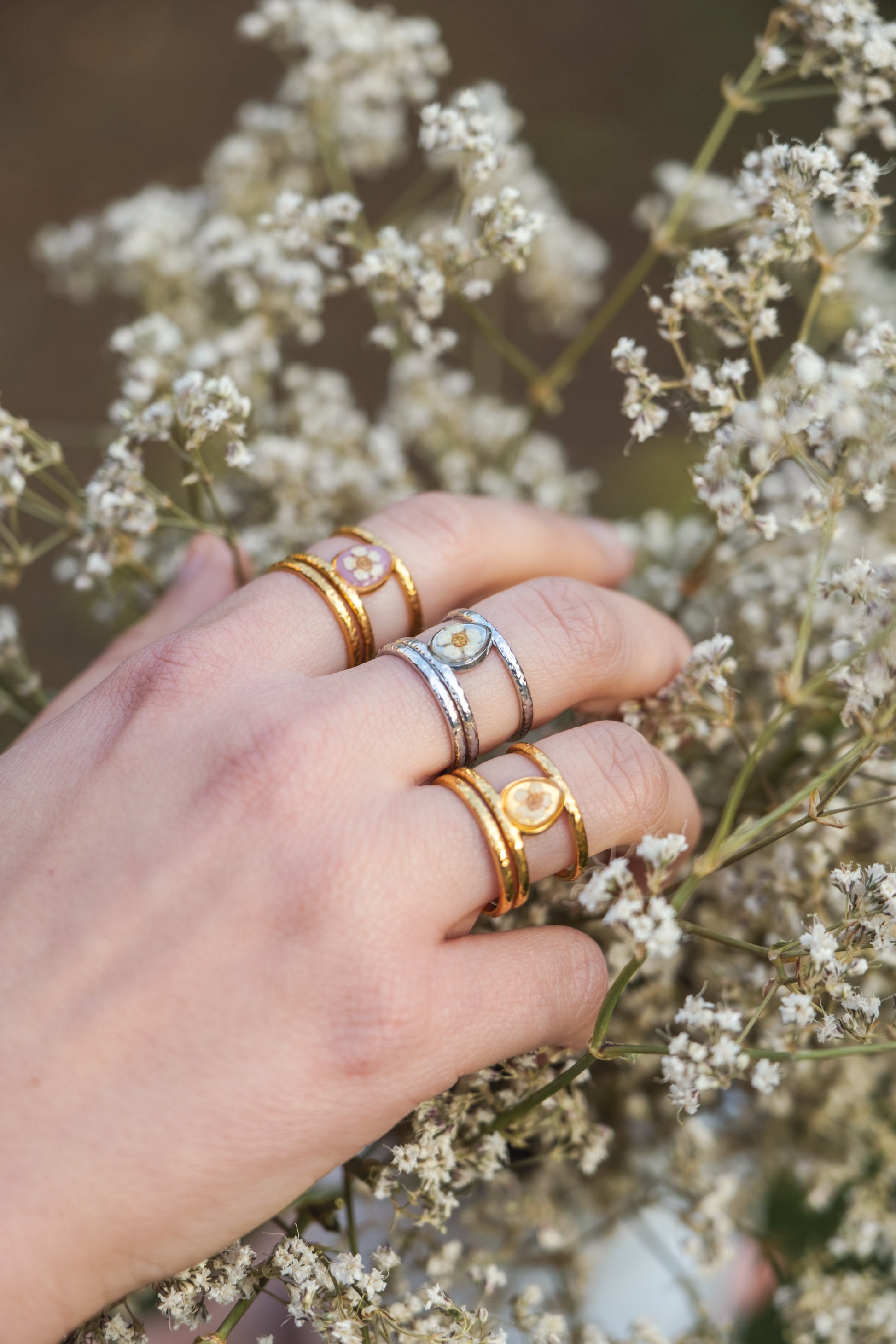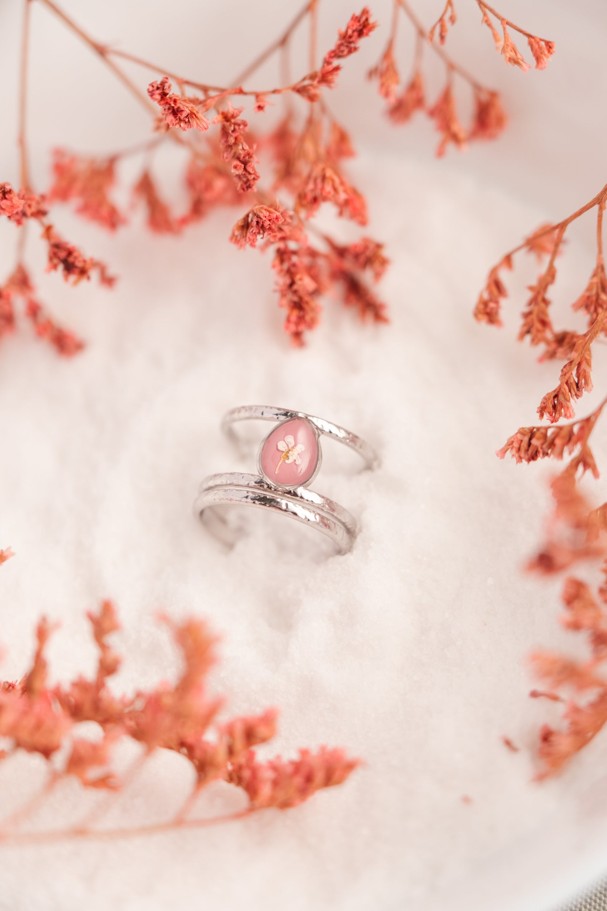 Anello regolabile doppia fascia, con fiori veri.