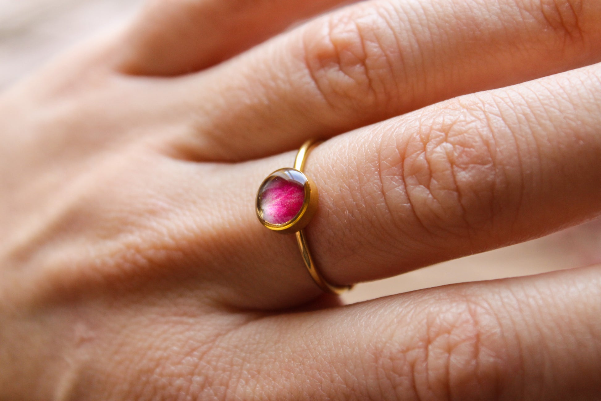 Anello regolabile con petalo di rosa gallica.